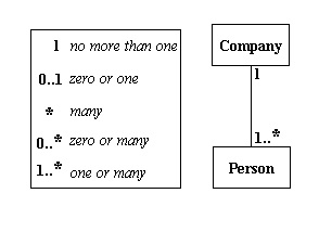 Place multiplicity notations near the ends of an association. These symbols indicate the linking of instances of one class from another. For example, one company will have one or more employees, but each employee works for just one company.