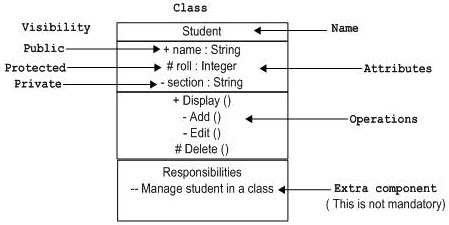 Classes represent an abstraction of entities with common characteristics. Associations represent the relationships between classes. In Example, classes with rectangles divided into compartments. Write the name of the class in the first partition, Enter the attributes in the second partition, and write all the operations into the third.