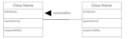 It represent static relationships between classes. Write association names above, on, or below the association line. Use a filled arrow to indicate the direction of the relationship. Place roles near the end of an association. Roles represent that two classes see each other.