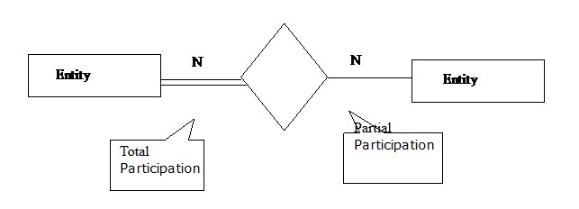 Total Participation − Each entity is involved in the relationship. Total participation is represented by double lines Partial participation − Not all entities are involved in the relationship. Partial participation is represented by single lines.